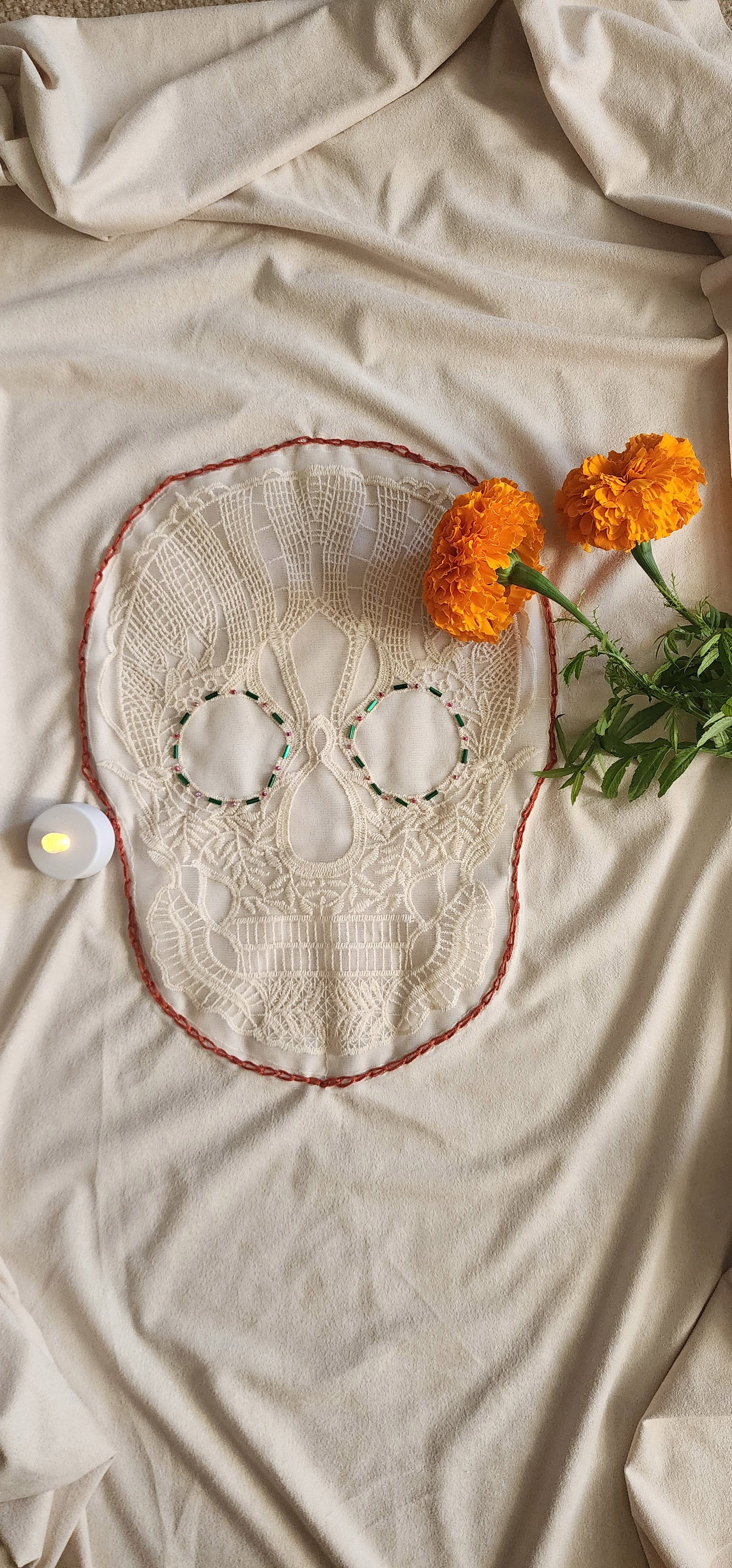 Our popular Manuela Wrap is back again but with more flare. The Limited Edition Skull Manuela Nursing Wrap is effortless fashion. Our wrap can be worn to nurse or pump discreetly or can be worn as a fashion statement during and after pregnancy. The skull applique is embroidered with a soft cream color while the beads liven up the image with pop of color that match with the rest of the Chica de Campo Collection.Β