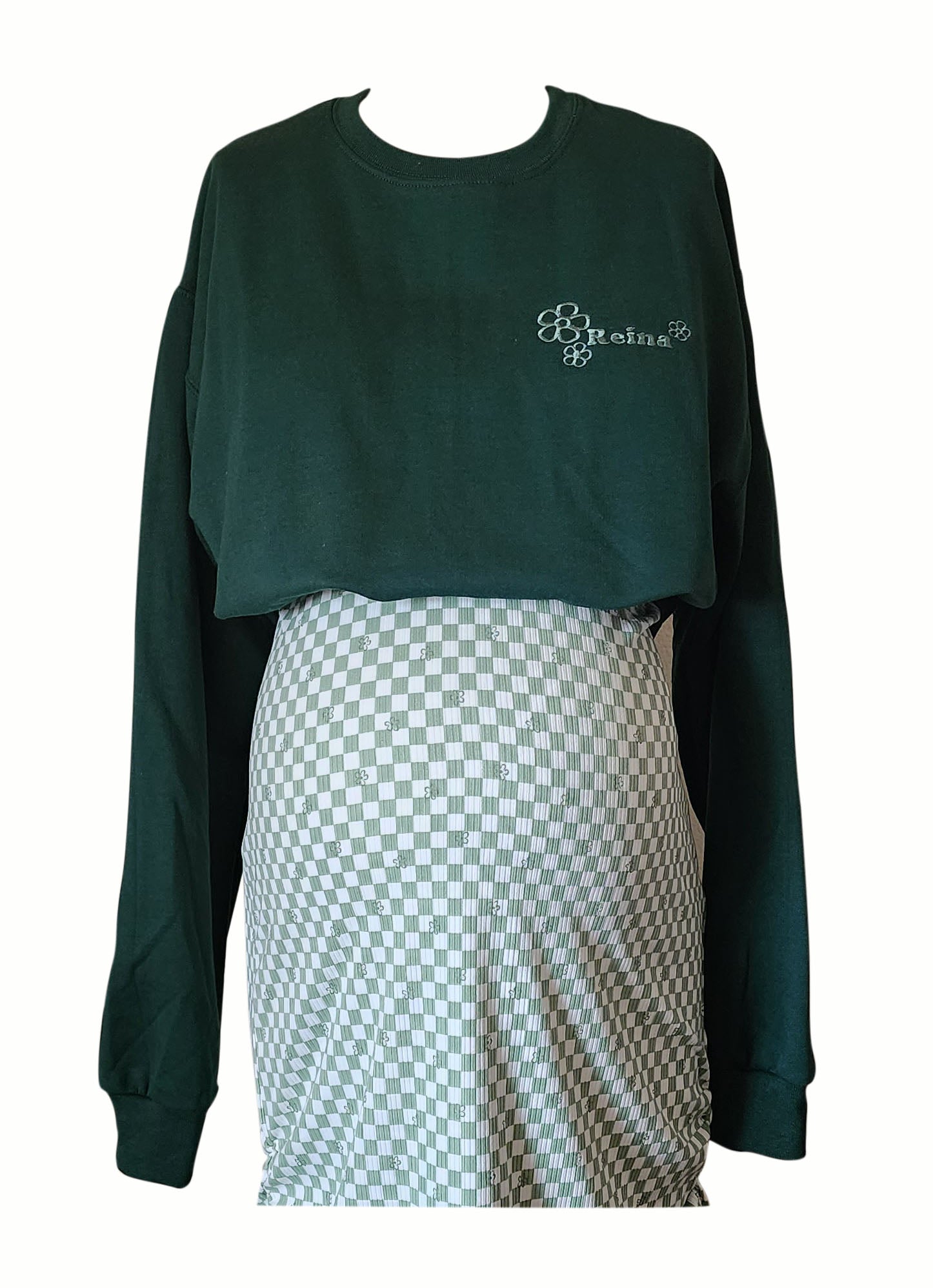 Our Reina Crop Sweater has a cropped fit to allows room for your growing belly during pregnancy and can easily be lifted to breastfeed or pump. The top has embroidered artwork on the left chest that reads Reina (Queen in Spanish) along with three cute retro flowers.